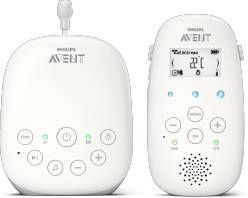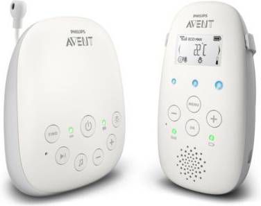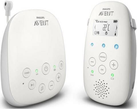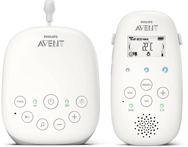 1. Kalmeer je baby met het nachtlampje en slaapliedjes2. Houd contact met de terugspreekfunctie3. De luchtvochtigheid en temperatuur in de babykamer meten 100% privé, zonder interferentieDECT-technologie zorgt voor een veilige privéverbinding, zodat je er zeker van kunt zijn dat je de enige bent die meeluistert en dat andere zendapparaten, zoals andere babyfoons en draadloze en mobiele telefoons, geen storing veroorzaken. Kristalhelder geluid DECT-technologie zorgt voor kristalhelder geluid, zodat je ieder lachje, murmeltje en hikje duidelijk kunt horen. Slimme ECO-modus De unieke slimme ECO-modus minimaliseert automatisch de audiotransmissie en vergroot de batterijlevensduur. Bereik tot 330 meter* *Bereik binnenshuis tot 50 m, bereik buitenshuis tot 330 m. Superieure gebruiksduur Met de handige oplaadbare ouderunit kun je je baby tot wel 18 uur draadloos horen voordat je de unit opnieuw moet opladen. De zekerheid van voortdurend contactDrie geluidsniveaulampjes geven het geluidsniveau in de kamer van je baby aan, zelfs als het geluid van de ouderunit is gedempt. Nachtlampje en vijf slaapliedjes Er gaat niets boven een rustig slaapliedje en de kalmerende gloed van een nachtlampje om een onrustige baby te kalmeren.